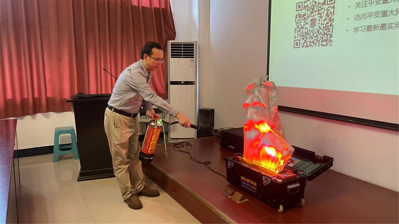 张吉喜强调了学习消防安全知识在教学科研和日常工作中的重要性。刘寅分别从常见火灾类型、灭火剂分类、火灾逃生技巧等方面,详细讲解了对应的重点知识。在随后的消防演练环节中,刘寅示范了消防器材的使用方法,在场师生纷纷上前进行了模拟灭火体验,在实操中运用所学到的消防知识。
