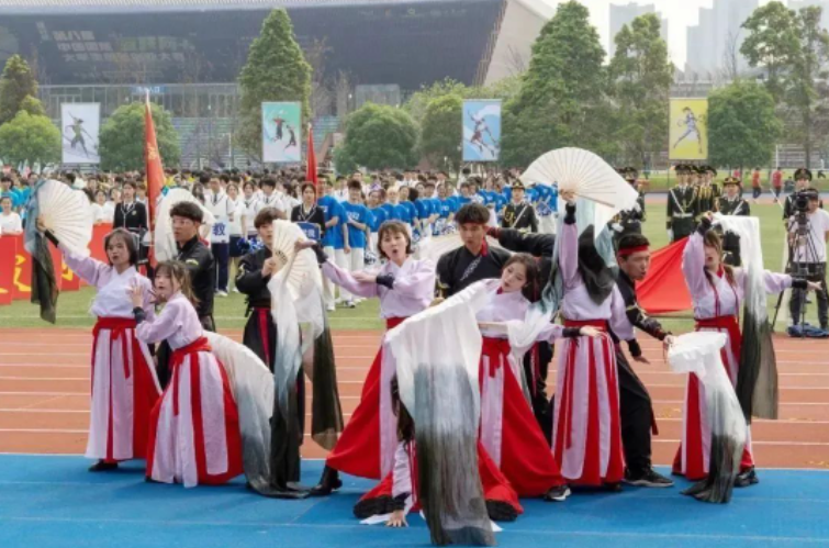 开幕式当天,方阵表演人员为主席台的观众们展示了国风绸扇舞蹈《华夏》,他们步伐统一、衣裙飘逸,七十余名同学经过多次排练最终呈递上了令大家喝彩的表演。方阵同学变换队形如游龙惊鸿,舞蹈同学在挥舞绸扇的过程中表演出太极图的黑白相生,舞出泱泱大国壮美民生,舞出一幅国泰民安人民健康的幸福画卷。