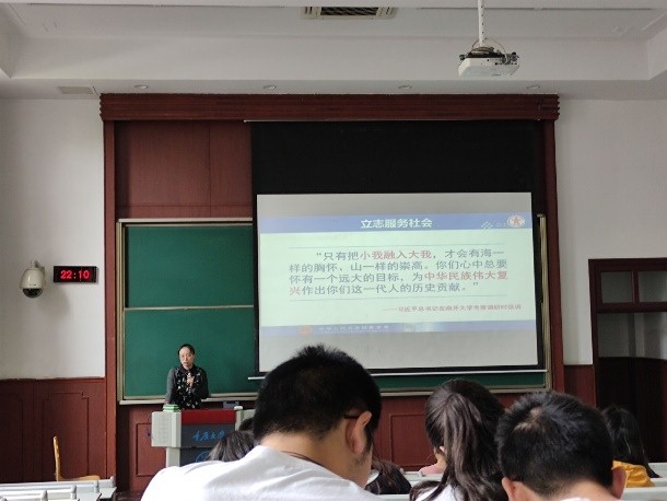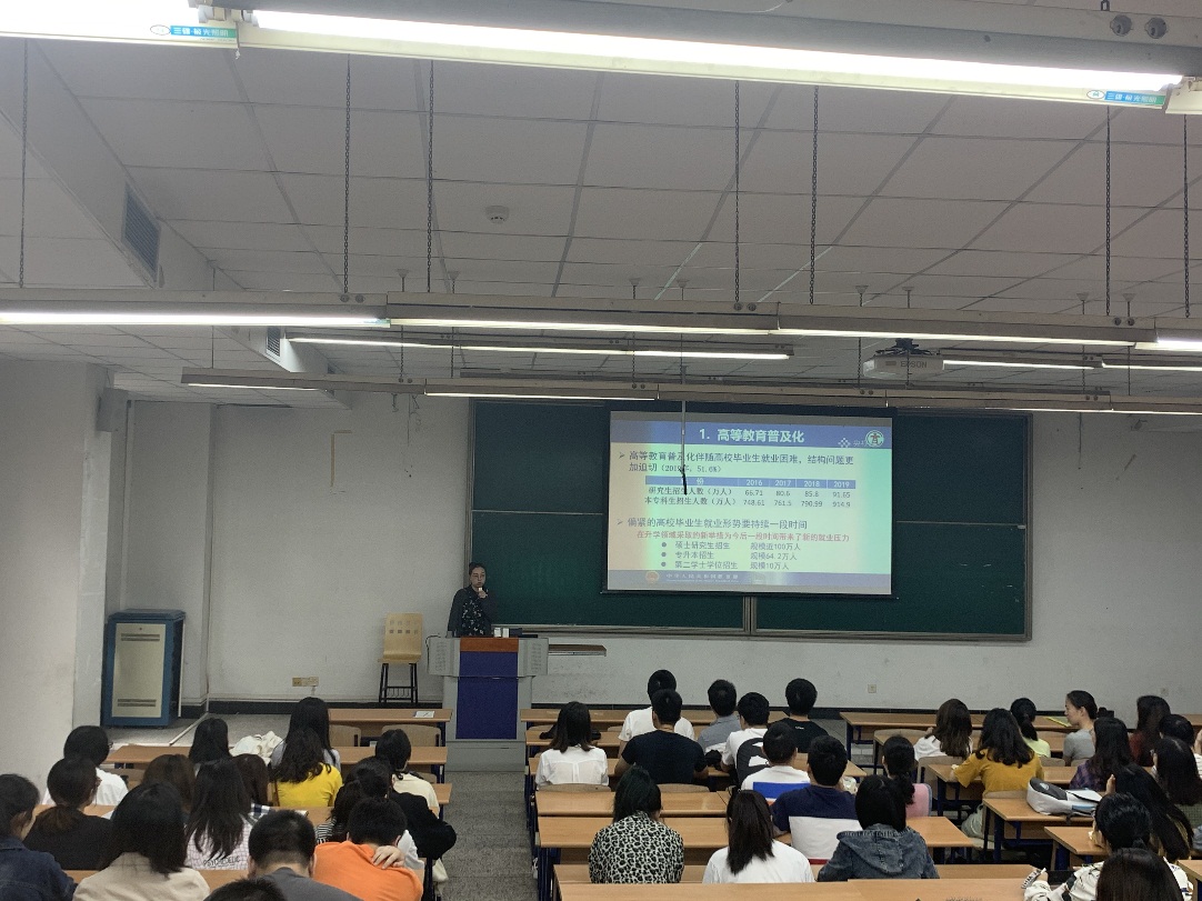 刘书记对就业方向进行解读,介绍各类政策性岗位以及各个基层项目,特别对特岗、三支一扶、西部计划、大学生征兵入伍、科研助理和服务社区岗位等项目进行解读。并借用习近平总书记在南开大学考察调研时强调的:“只有把小我融入大我,才会有海一样的胸怀、山一样的崇高。你们心中总要怀有一个远大的目标,为中华民族伟大复兴作出你们这一代人的历史贡献,”并鼓励同学们将服务社会、国家、人民定为终身目标,在求职时到西部去、到基层去、到祖国最需要的地方去。