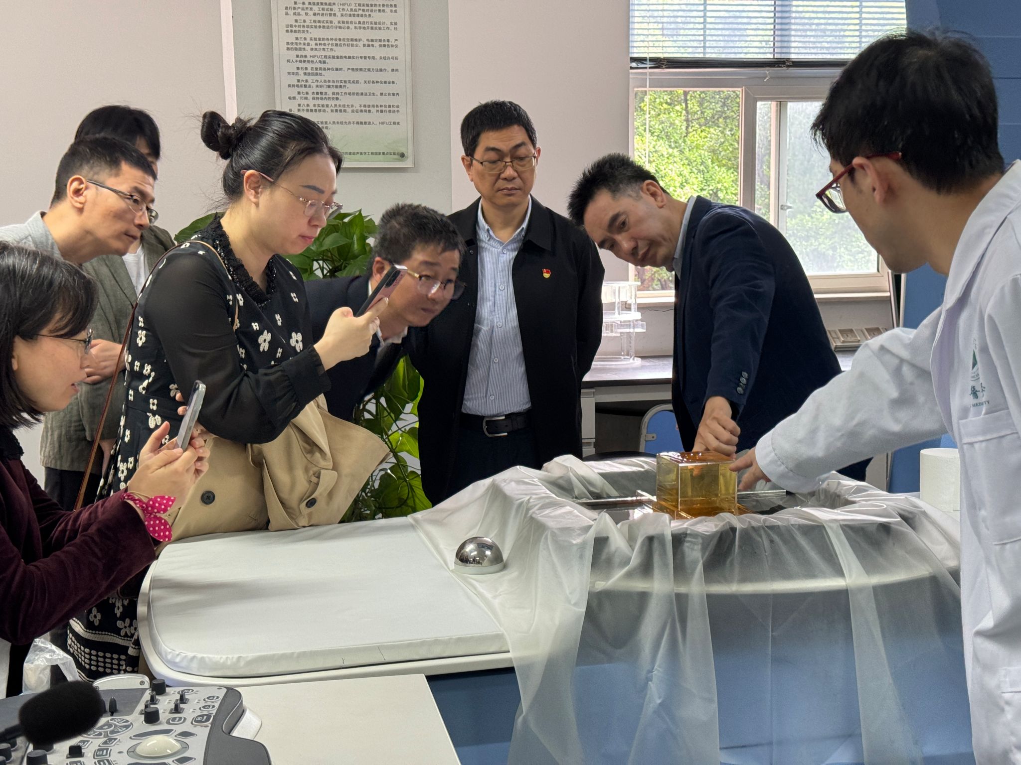 重庆医科大学生物医学工程学院办公室主任杜永洪教授向yl6809永利官网胡友强书记一行详细介绍了超声医学工程国家重点实验室发展历程,随后大家饶有兴趣地观摩了由重点实验室王琦老师演示的聚焦超声体膜实验,感受聚焦超声刀在玻璃板上切割,双方教师就其中关键技术进行亲切交流。