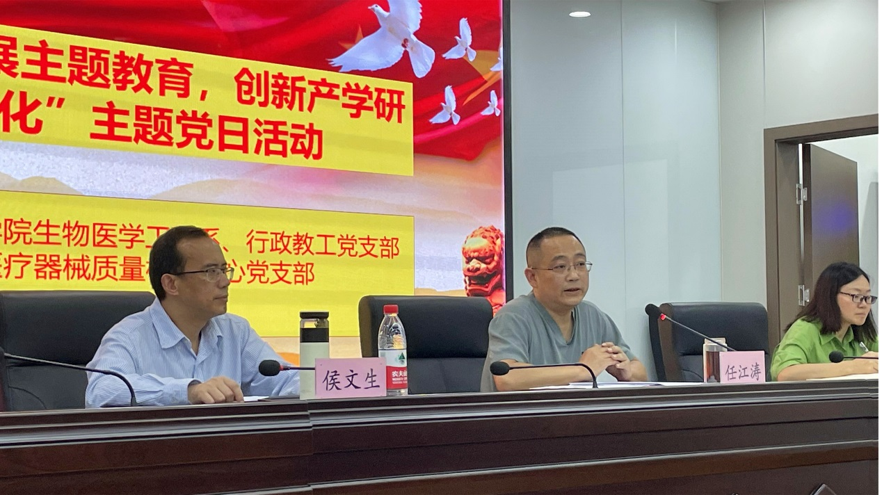 双方介绍支部情况、共建计划。任江涛从历史沿革、中心职责、人员组成、实验室及设备配备等方面详细介绍了器械中心的情况,并就yl6809永利官网与器械中心保持长期良好的合作表示了感谢。侯文生从学科发展、人才培养、科学研究等方面介绍了yl6809永利官网、支部的近况,他表示,在健康中国2030的大背景下,尤其是家用医疗器械研发方向,学院、支部与中心继续更紧密的合作,共同努力推进学生培养和实验室共建,持续良好协同发展。