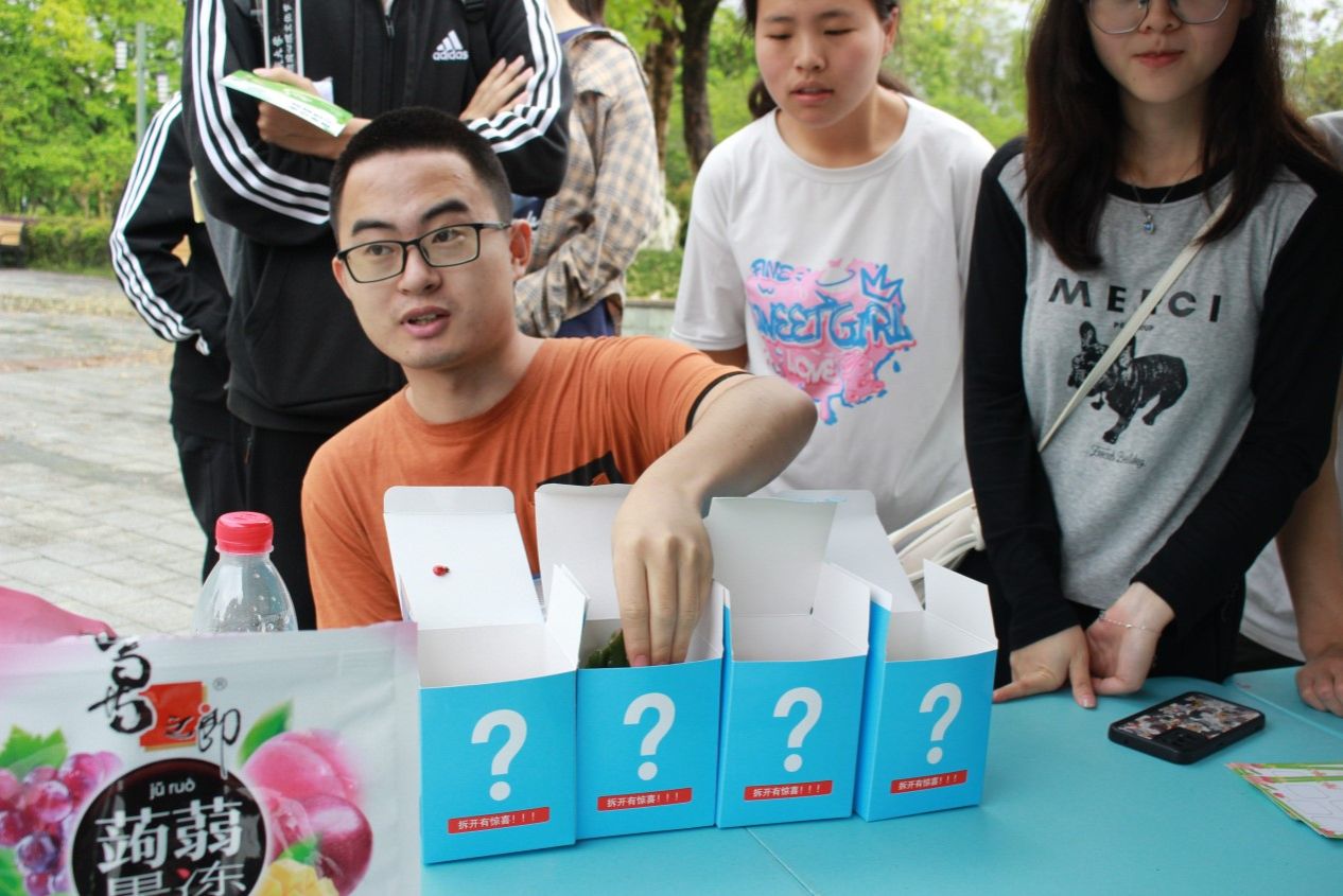 参与“触”打卡的同学需要触摸盲盒中的植物,猜出植物名字或成功形容出植物样子。面对未知,同学们需要心中无畏、建立物我连接,方可通过考验。此打卡点既考验参与者的生活经验积累,也十分锻炼参与者的想象力和胆量。
