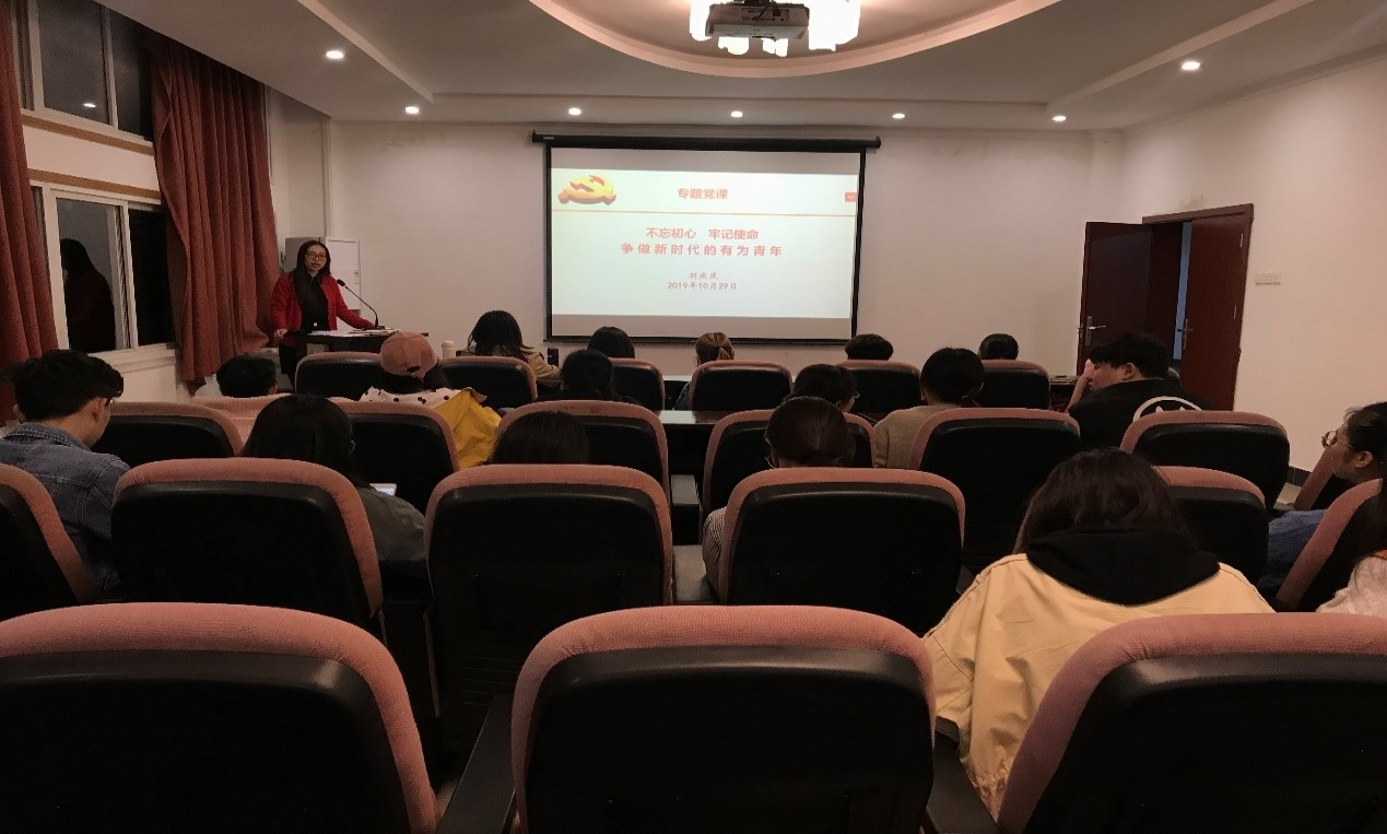 2019年10月29日晚,yl6809永利官网党委副书记刘庆庆讲授了“不忘初心 牢记使命——争做新时代的有为青年”专题党课,学院专兼职辅导员、本科班主任以及学生党员代表参加。