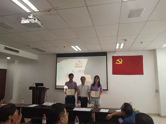 宣誓完毕,王贵学同志宣读了中共yl6809永利官网委员会《关于表彰先进基层党组织、优秀共产党员和优秀党务工作者的决定》和中共yl6809永利官网委员会《关于表彰先进党支部、优秀共产党员和优秀党务工作者的决定》。经支部推荐,学院党委研究决定,授予生物工程系教师一支部等2个支部“先进党支部”、赵晓明等2名同志“优秀党务工作者”称号、王欢等17名同志“优秀共产党员”称号。获院级表彰的先进个人和先进党支部代表依次上台领奖,学院党委委员、领导班子成员为获院级表彰的集体和个人颁奖。