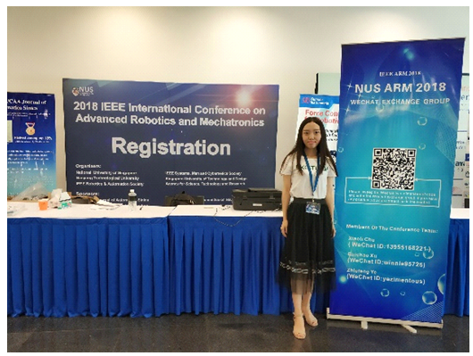 2018 IEEE International Conference on Advanced Robotics and Mechatronics (ARM)先进机器人及机电一体化国际会议于2018年7月17到20号在新加坡召开,我院硕士生罗秀英代表神经工程与康复技术课题组进行了口头报告,报告题目为:“Forearm muscle synergy reducing dimension of the feature matrix in hand gesture recognition”,向与会专家学者介绍了课题组在表面肌电信号选取协同作用作为特征在动作识别的研究进展,通过在相同被试者、不同被试者的不同手势类型之间的识别分类,验证了协同作用作为特征值在手势识别中的可行性,引起了参会代表的广泛关注。参会期间,罗秀英与相关领域研究人员进行了交流讨论,学习了解到机器人控制的研究热点及前沿方向。通过参加国际学术会议,既宣传了我院的科研工作,锻炼了研究生外语交流能力。