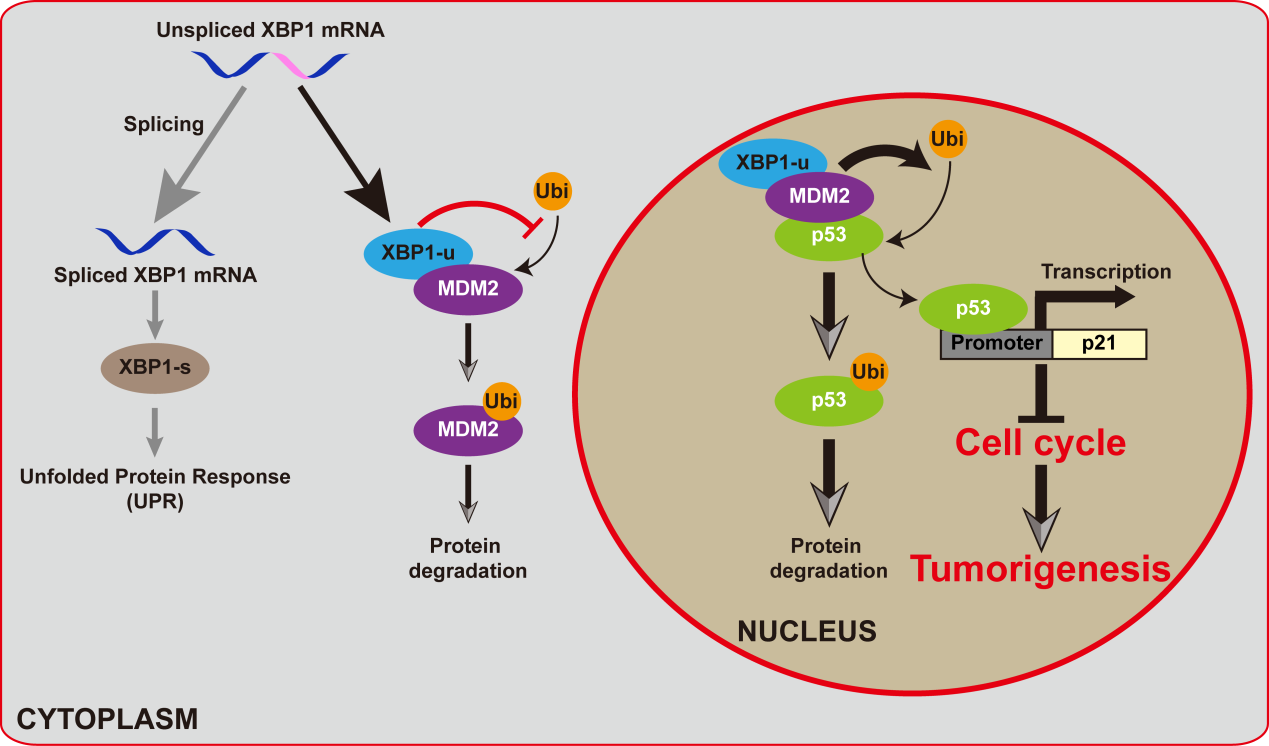 近日,yl6809永利官网江启慧课题组与吴寿荣课题组在美国科学促进会(AAAS)出版的《Science Advances》(Science子刊)上发表了题为“Identification of XBP1-u as a novel regulator of the MDM2/p53 axis using an shRNA library” (通过RNA干扰质粒文库筛选发现MDM/p53信号通路重要新调控因子XBP1-u)的研究论文。
