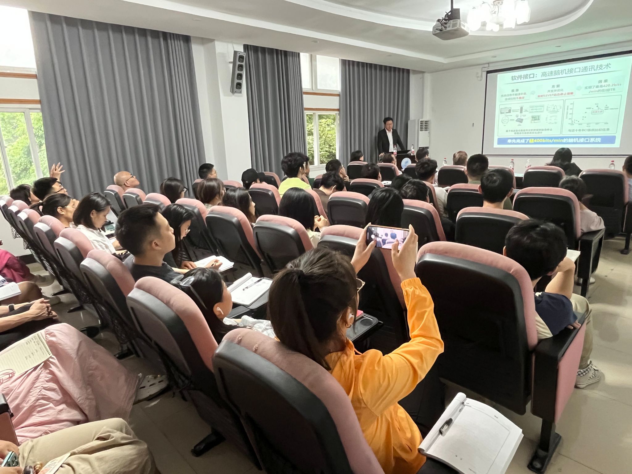 报告会上,许敏鹏教授首先从手机入手,引出“脑机”,指出“脑机”是人机交互的最优模态,指出脑机接口技术一直是世界各国竞相角逐的战略高地,抢占脑机接口技术制高点关系国防与经济安全。随后,许敏鹏教授指出无创脑机接口的挑战,并从硬件接口、软件接口和典型应用三个层面介绍了如何解决大脑与机器之间的接口问题,内容丰富、深入浅出。报告中,许敏鹏教授详细介绍了其在传感电极、放大芯片、集成系统、编码范式、认知模型、解码算法、面向航天应用、面型医学应用等的研究成果。报告结束后,广大师生踊跃提问,与许敏鹏教授进行了广泛而深刻的交流讨论。